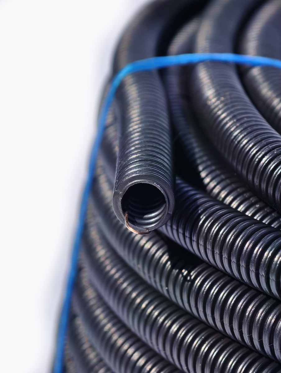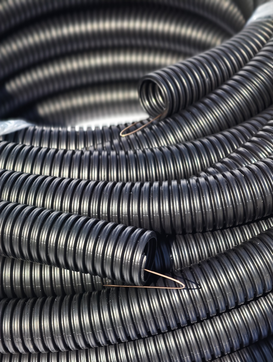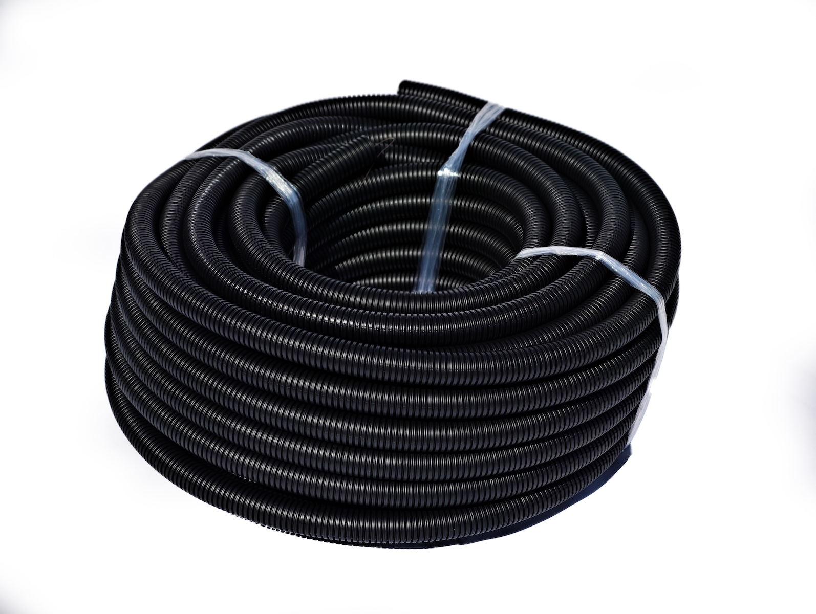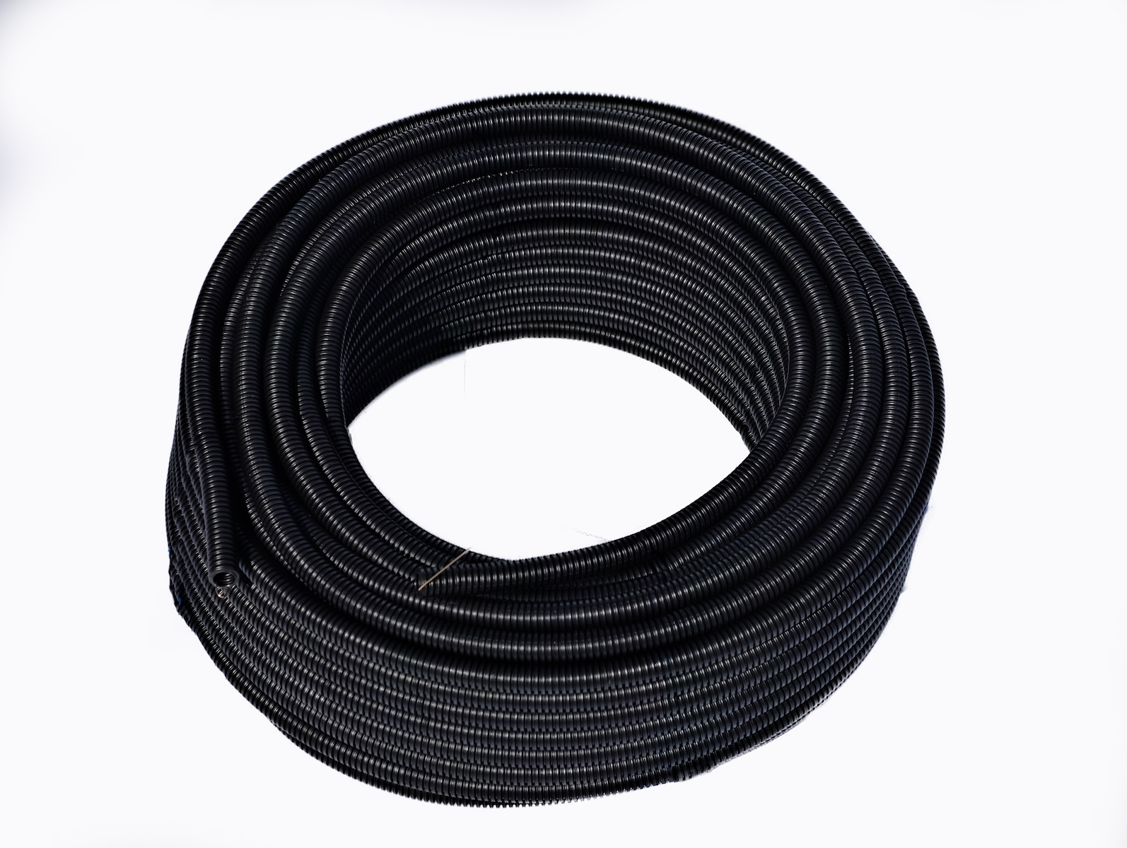 Tub gofrat negru 320N, HF, stabilizat UV, cu fir de tragere este un tub flexibil de protecție pentru cabluri electrice, realizat din polietilenă de înaltă densitate (HDPE), fără halogeni și cu proprietăți excelente de izolație electrică. Este proiectat pentru protecția și ghidarea cablurilor în instalații moderne, disponibil în diametre de la 9 la 50 mm, în colaci, și echipat cu fir de tragere din oțel de 0,9 mm pentru montaj rapid și eficient. Varianta neagră este stabilizată UV și funcționează într-un domeniu larg de temperatură, de la aproximativ -40°C/-45°C până la +105°C.